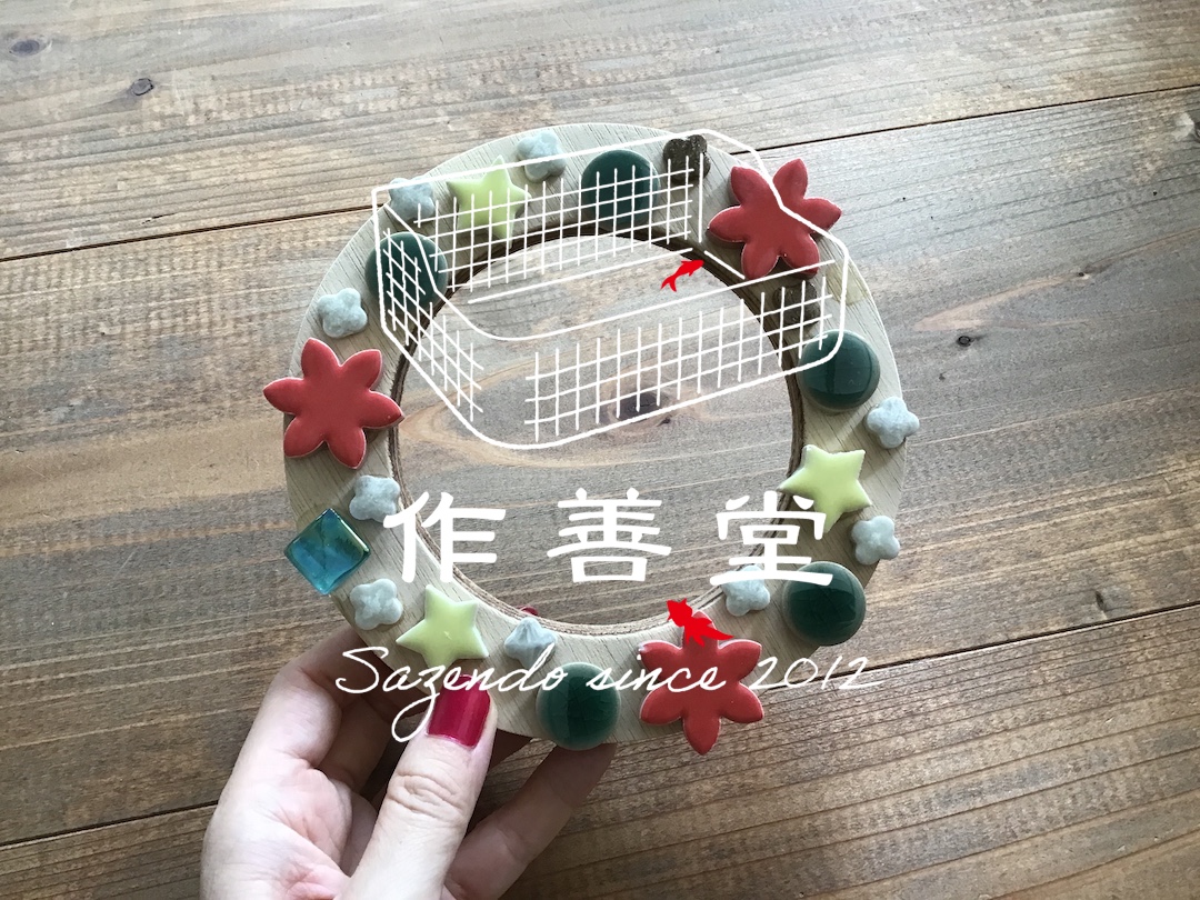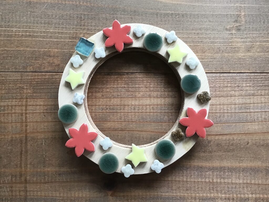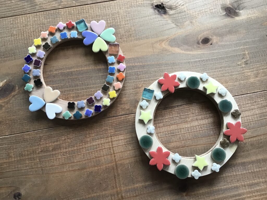木枠に好きなタイルを貼っていけば可愛らしいタイルリースが完成する素敵なタイルクラフト!不思議なもので、同じタイル素材から作っても一人一人の個性が表れて違った完成になります。