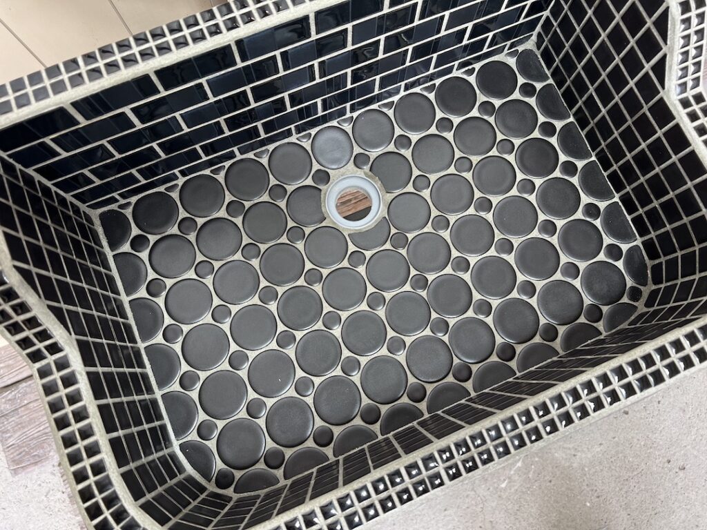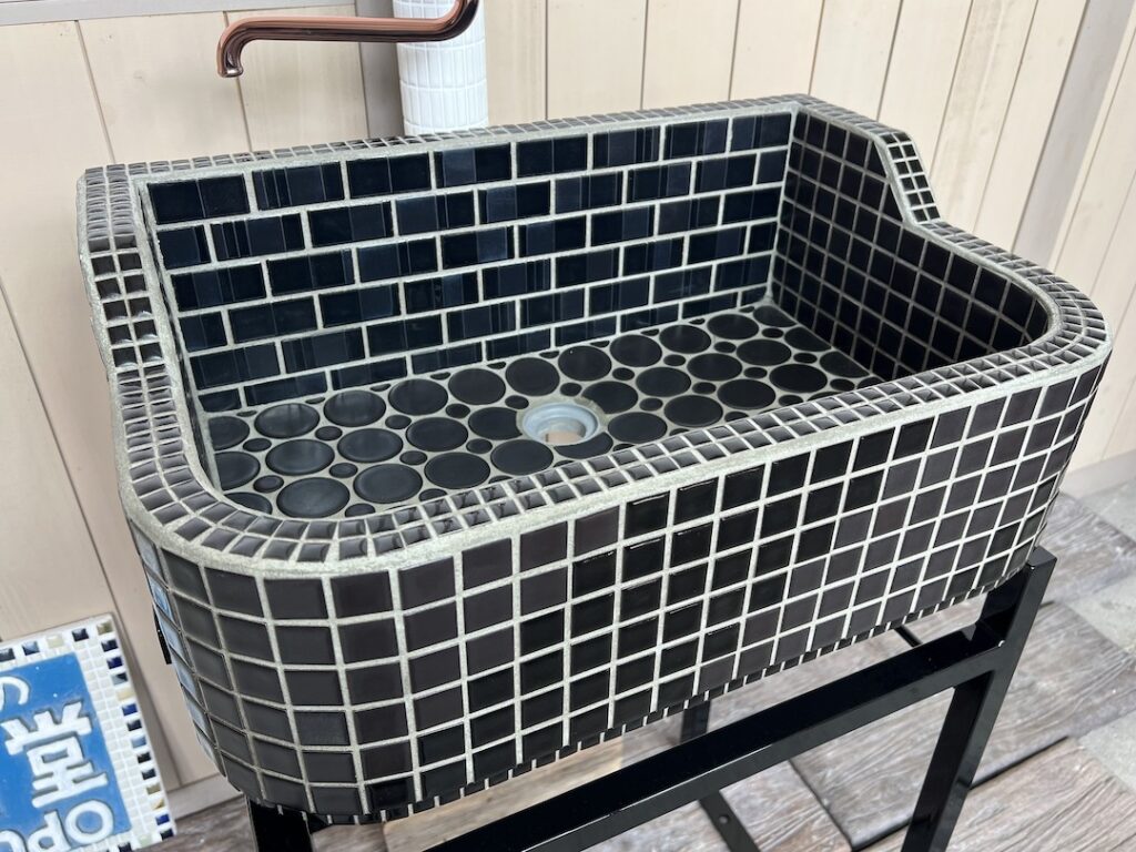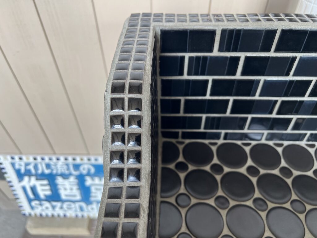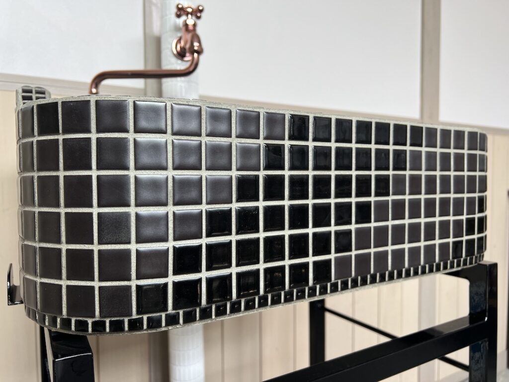 内側は、使用中の傷が目立ちにくいよう、主にマットな質感のタイルを使っています。一方、外側はブライトとマットのタイルを段々に配置しているため、光の当たり方によってさまざまな表情が楽しめます。同じ黒色でありながら、質感の違いで生まれるグラデーションが、シンク全体に奥深さを与えています。