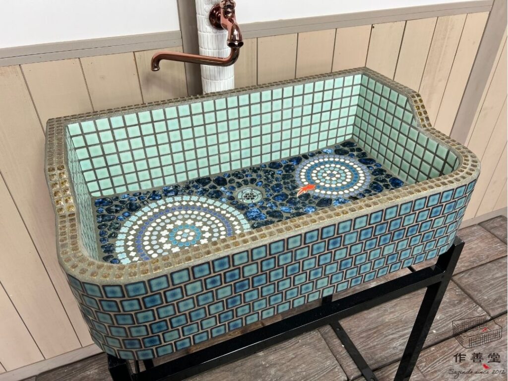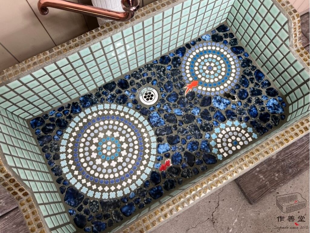 そして、底面には「これぞ作善堂のシンク!」というシンボルの金魚タイルも気持ちよさそうに泳いでいて、水を流すのが楽しくなること間違いなしです!