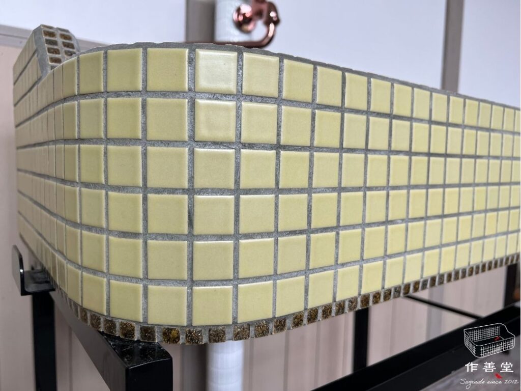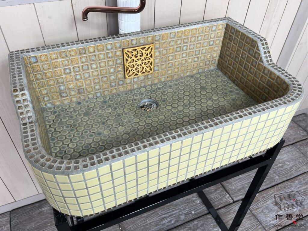 最後のご紹介は、作善堂としてはちょっぴり珍しい、イエロー系を基調とした新作シンクをご紹介します。新しいのに、どこか歴史を感じる、特別な魅力を持った一台です。
