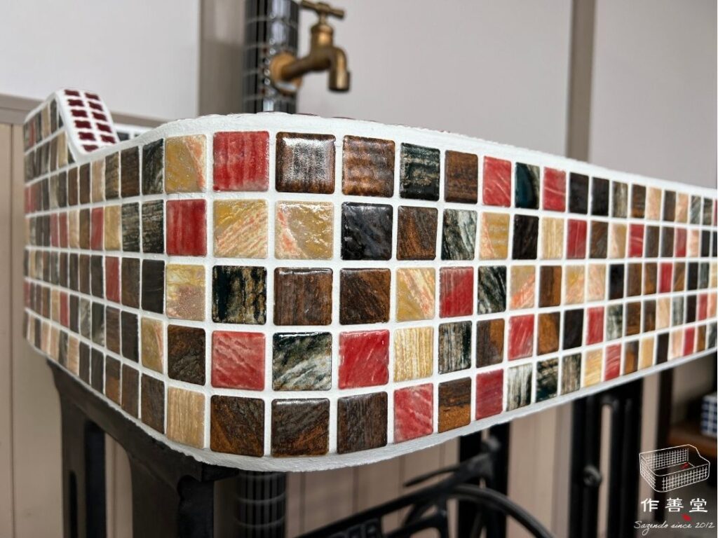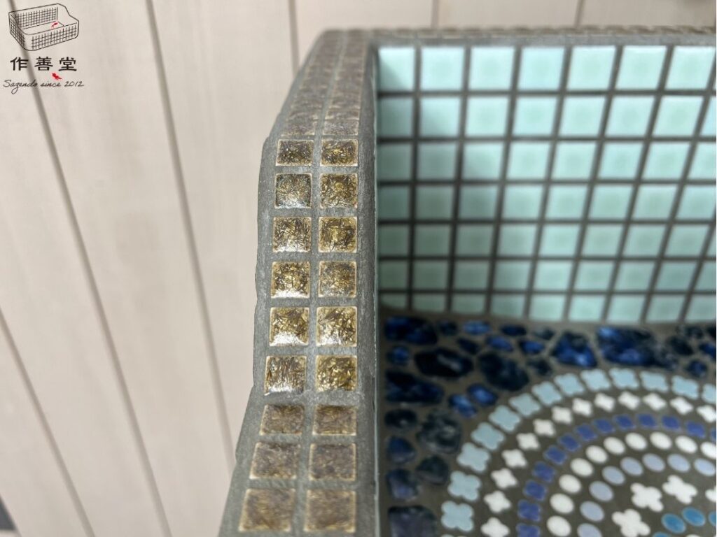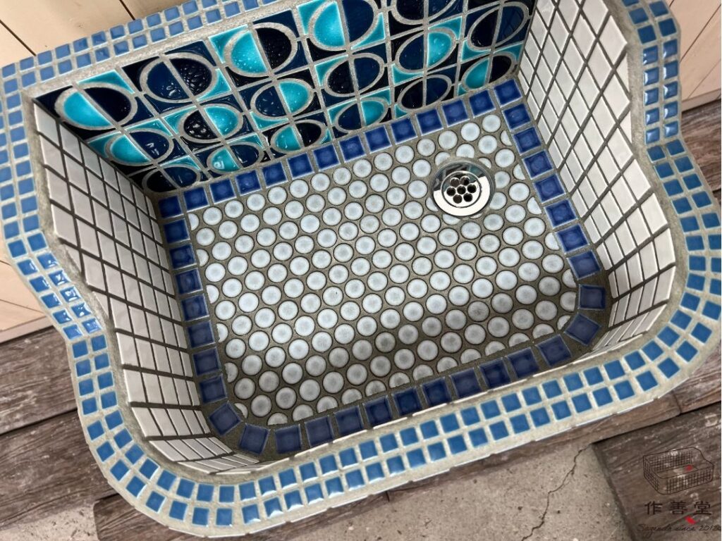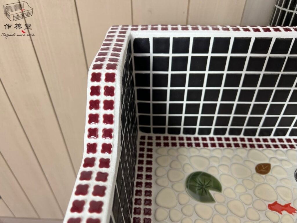 底面には作善堂で人気のデザイン“水紋柄”を手並べで表現しました。小さなタイルを多色使いすることで、水面に波紋が広がるような、華やかで奥行きのある模様が生まれています。