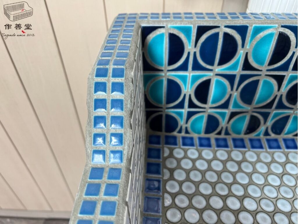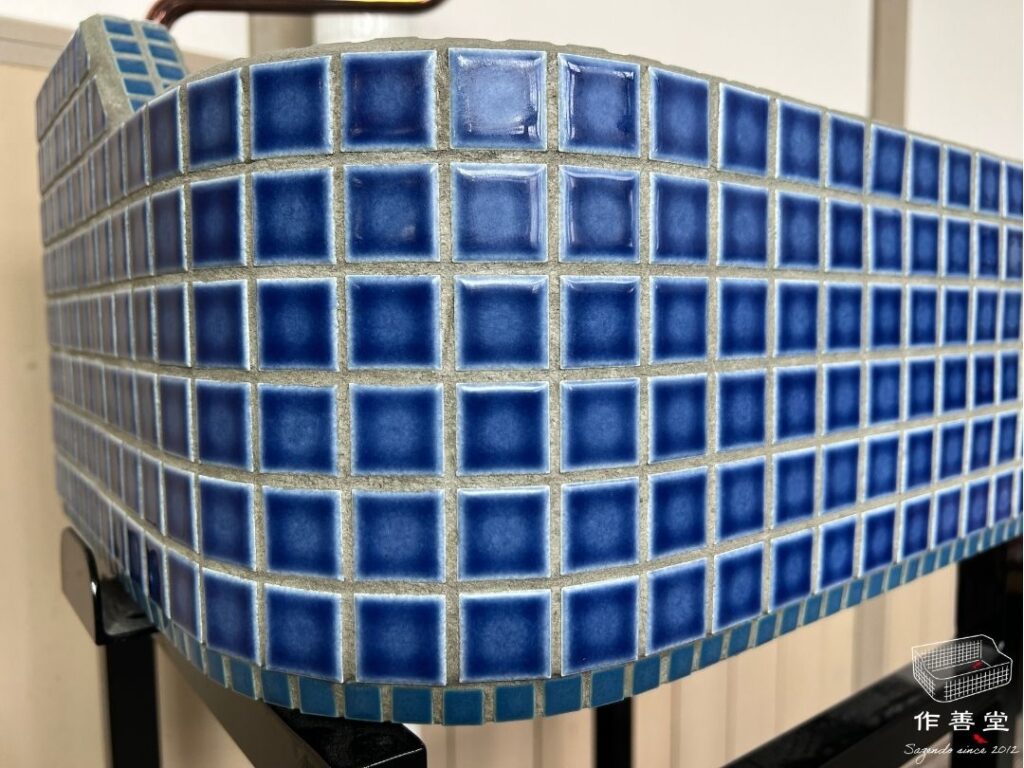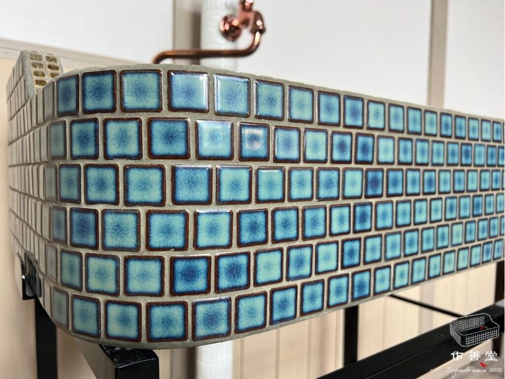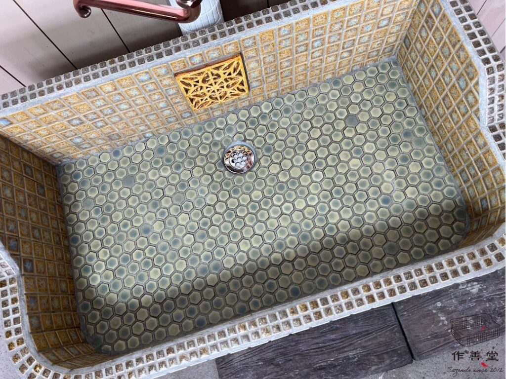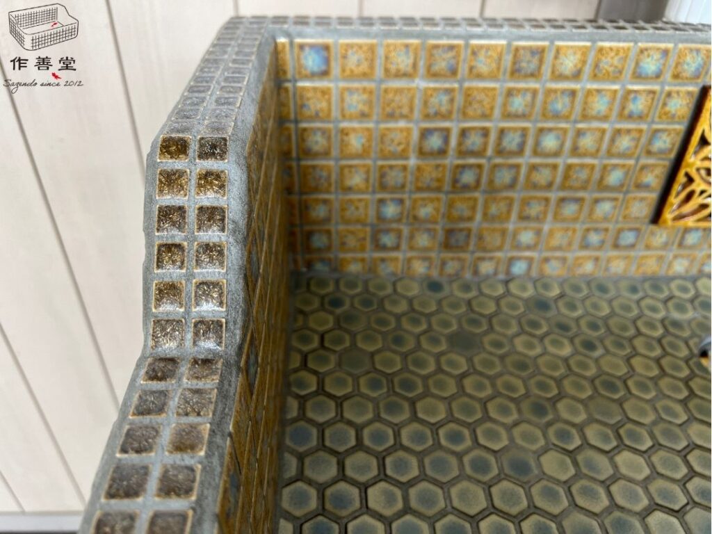 特に底面のタイルは、形も色もなかなかお目にかかれない、レトロで貴重なタイルを使っています。「昔、こんなタイルを見たことがある」と感じる方もいらっしゃるかもしれませんね。
