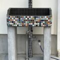 このシンクの一番の魅力は、素朴な風合いに映える、赤が基調のミックスカラータイルです。暖かみがありながらも、どこか目を引く色合いが、お庭の主役になってくれます。