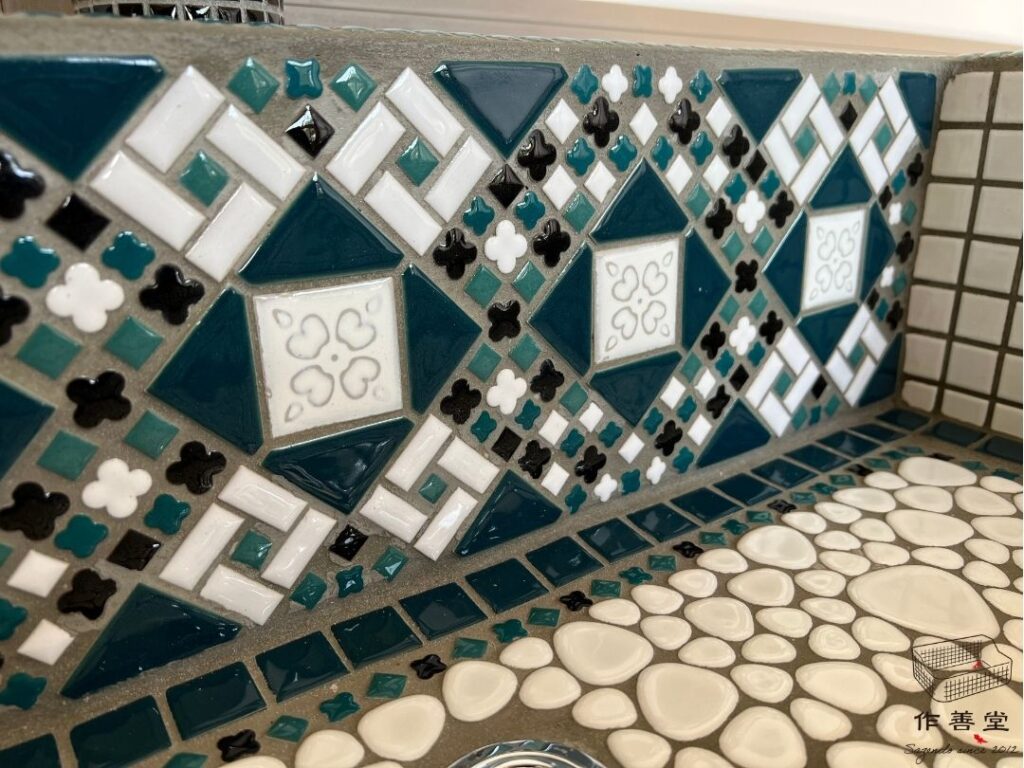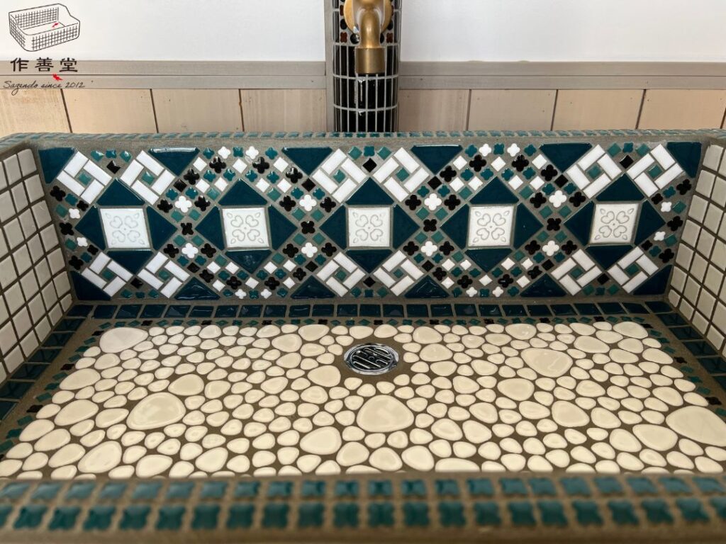 こちらのシンクのポイントは、現在は生産されていない貴重なレトロなタイルと様々なバリエーションの小さなタイルを手並べで組み合わせた正面のデザインです!ぱっと目を引くパターンで、タイルの大小がリズムを感じさせてくれます。