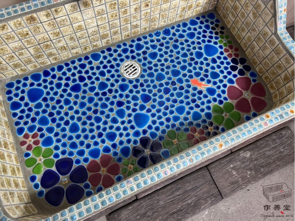 底面には覗き込むと手書きのお花タイルと金魚タイルが可愛く配置されているので、使う時もほっこりした気持ちで楽しくお使いいただけます。