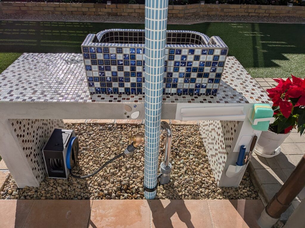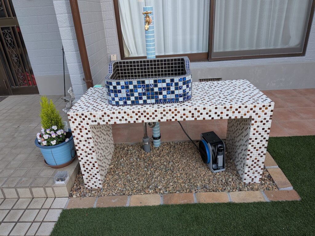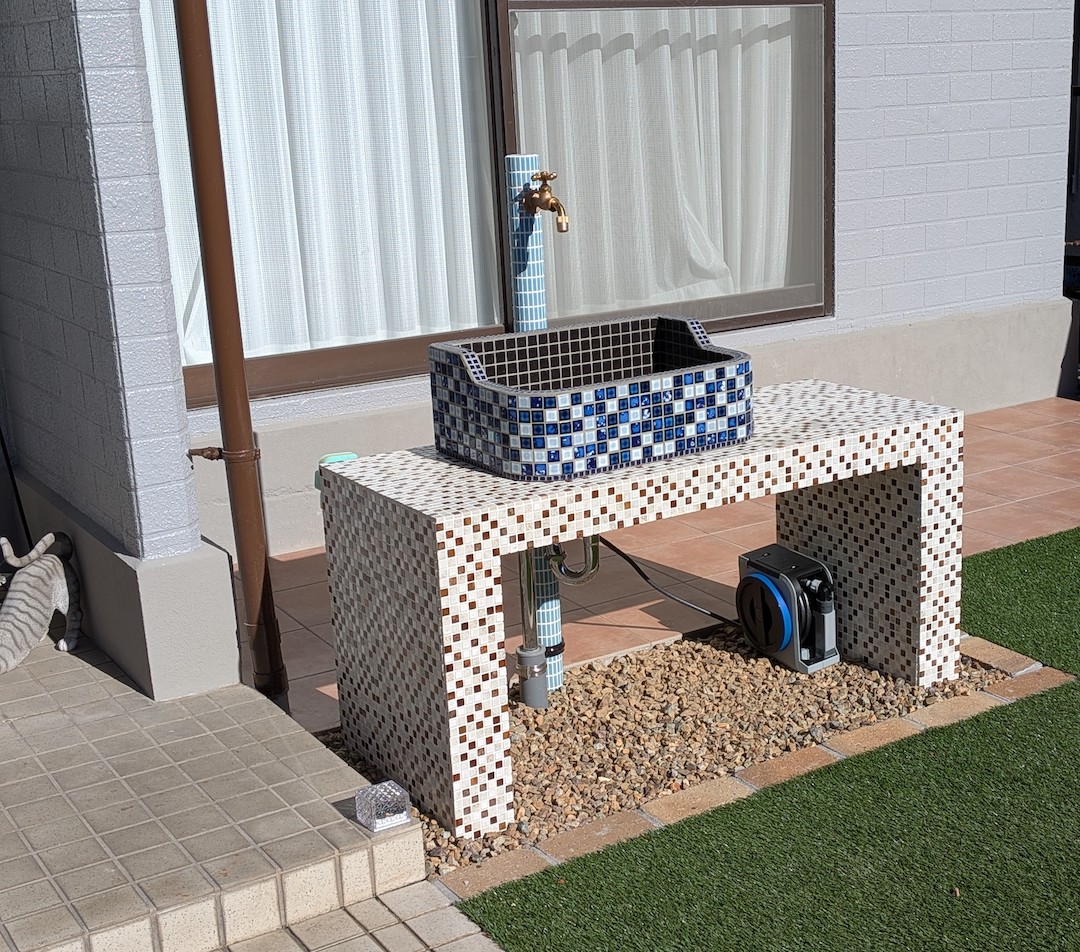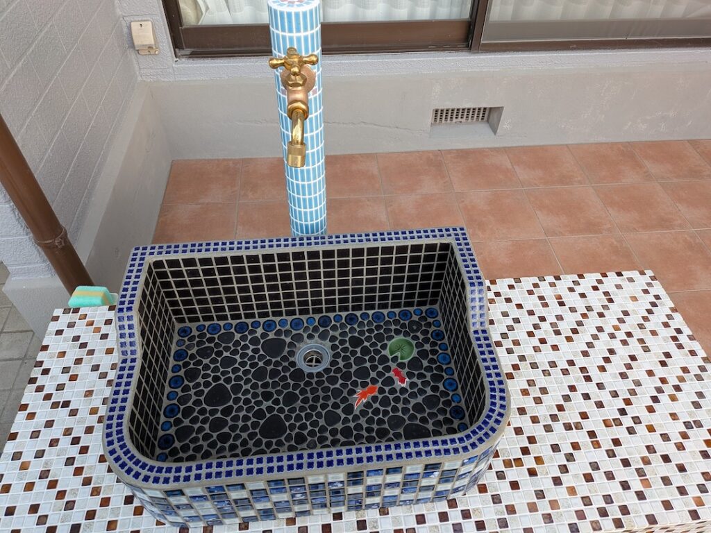 庭のリフォームの際、以前から憧れていたタイルシンクとモザイクタイルの作業台を置きました。モザイクタイルも作善堂さんからです。地元のタイル屋さんに作ってもらいました。作業台の裏側は磁石シートを貼ってスポンジやシャベルをかけられる様にして、使いやすくなりました。二口の水栓柱なので水撒き用のホースリールをつなげたままで、毎日使っています。素敵なタイル製品をありがとうございました。
