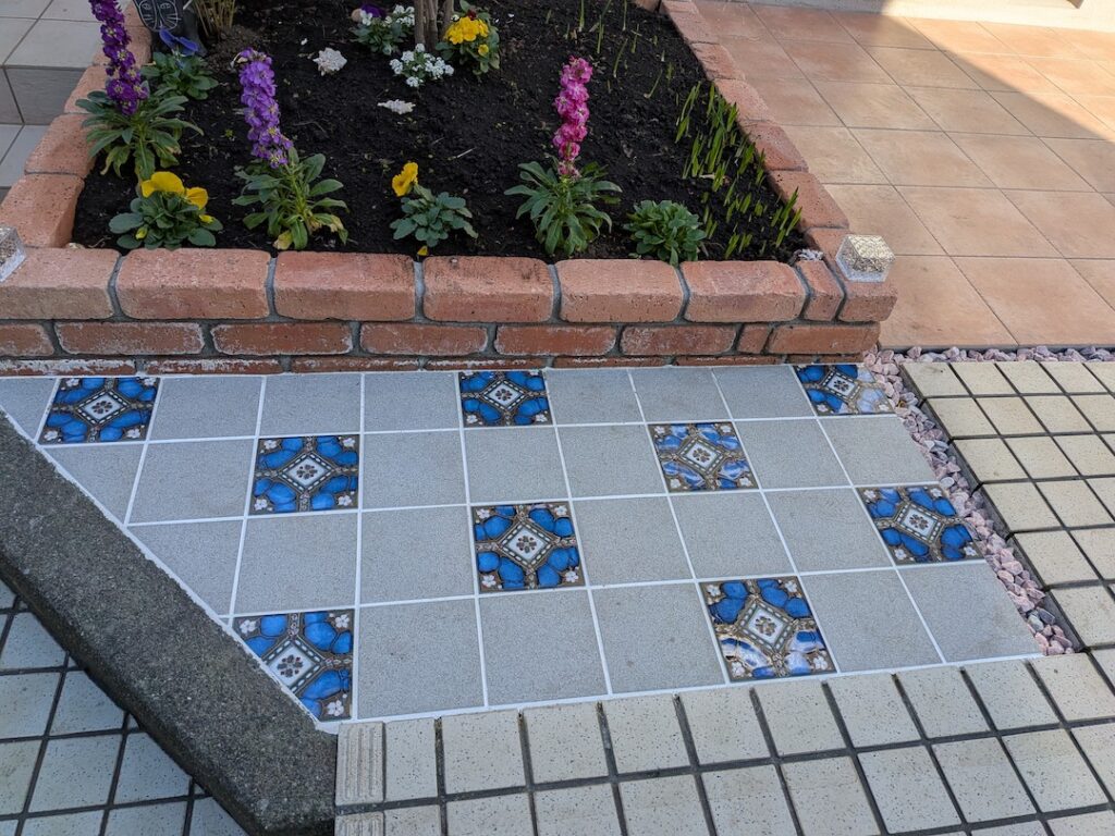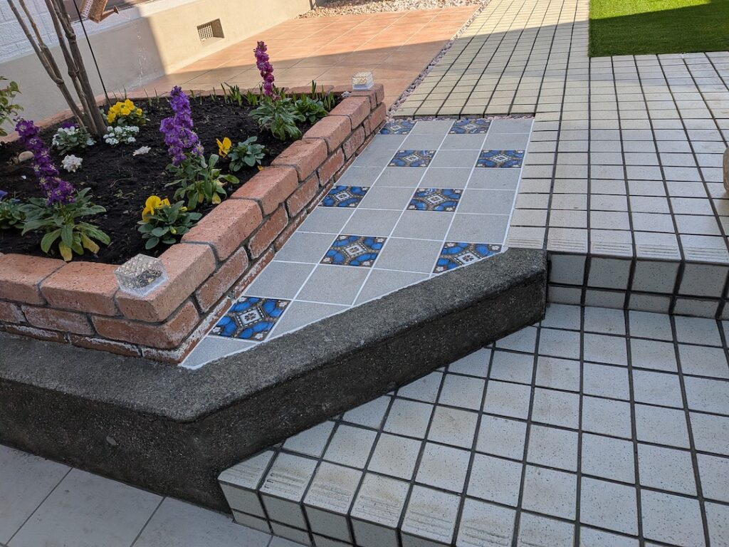 美濃焼きタイルをアプローチのアクセントに使わせていただきました。1番目立つ所なので、花壇のレンガとはちょっと違う色合いにしてみました。華やかだけど落ち着いていて、作善堂さんのタイルにして正解でした。