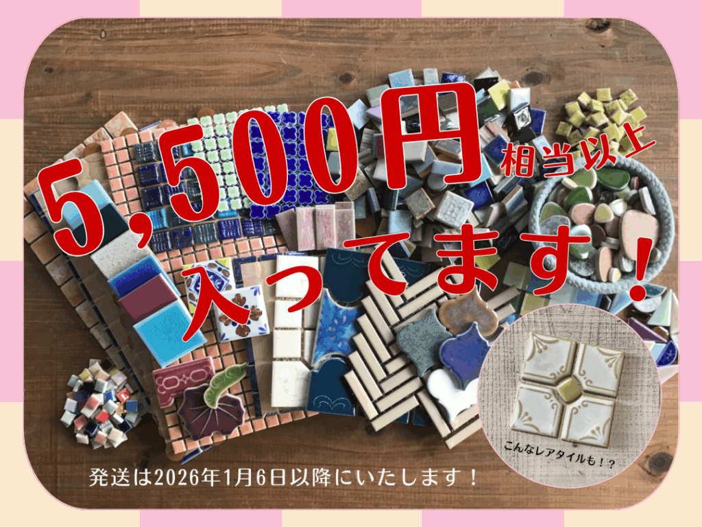 今年もたくさんのタイルを扱う中で生まれた「ちょっと珍しいタイル」や「もう手に入らないかもしれない限定タイル」などを感謝の気持ちを込めて、あれやこれやとギュギュッと詰め込みました!5,500円相当以上入っているお得な福箱となっておりますので、ぜひお買い求めいただけたらと思います!