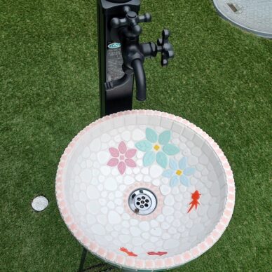 【お客様からのコメント】彩りあるお花が可愛いボールシンク。近づくと金魚さんが見えてきます。来年開園のブルーベリー農園に置かせてもらってます(#^^#)